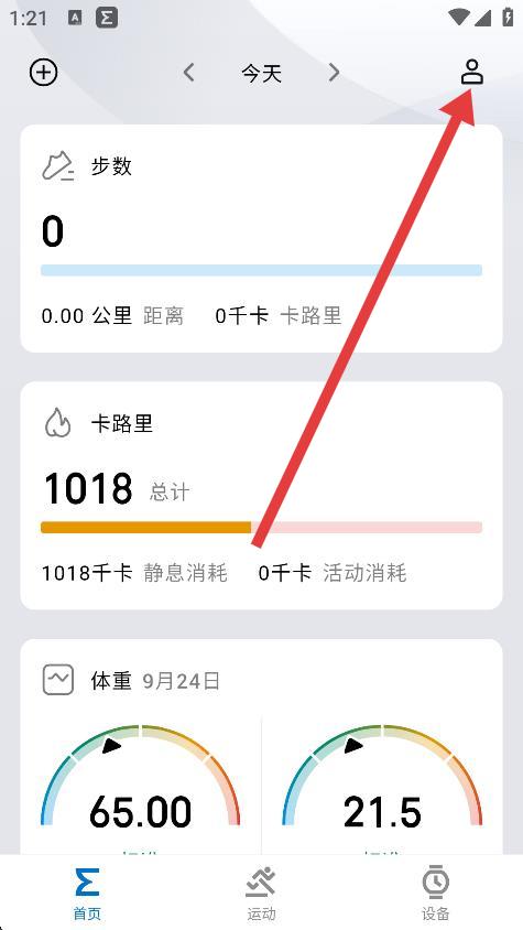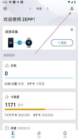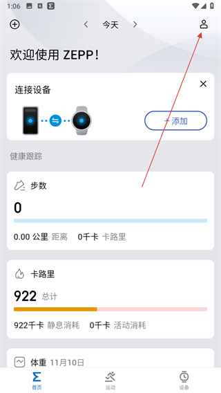 1、打开Zepp应用,点击首页右上角的个人中心图标。