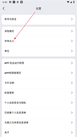 3、在设置页面中,点击字体大小选项,进入字体大小设置页面。