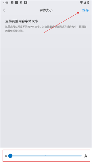 4、在字体大小设置页面,拖动底部的滑块调整字体大小后点击保存。
