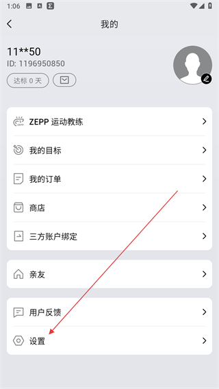 2、进入我的页面后,点击设置选项,进入设置页面。