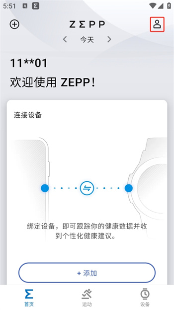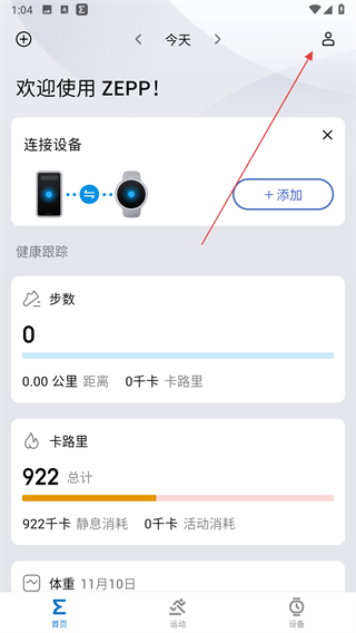 1、打开ZeppApp,进入到主页,点击主界面右上角人像的图标。
