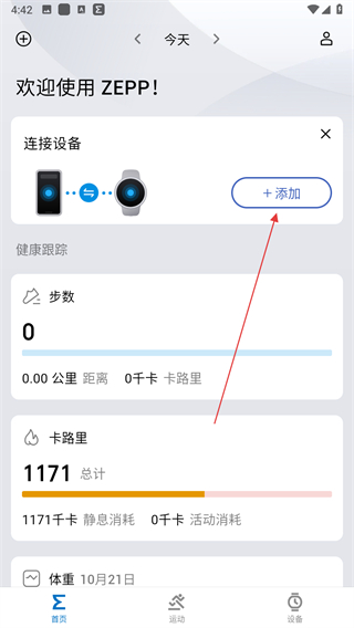 1、打开Zepp应用,在首页的连接设备区域,点击+添加。