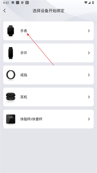 2、进入选择设备开始绑定页面后,点击手表选项。