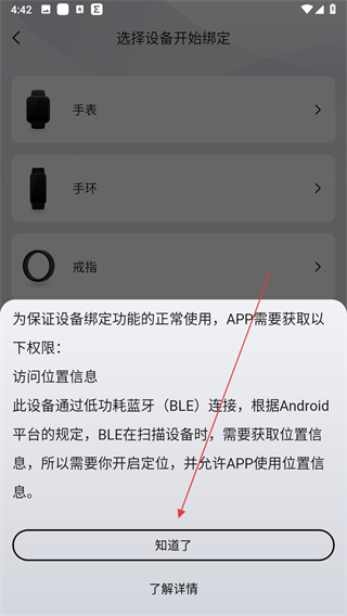 3、在弹出的权限提示框中,点击知道了,按照提示开启定位。