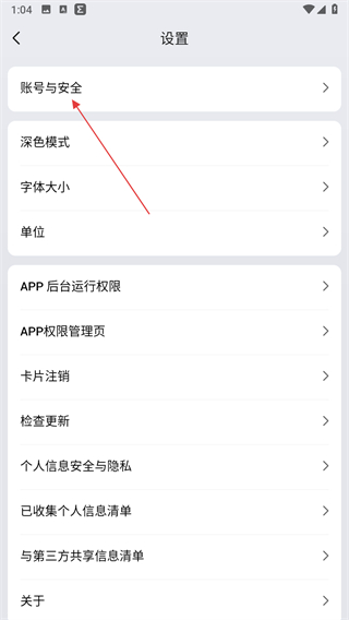 3、在设置页面,点击账号与安全选项。