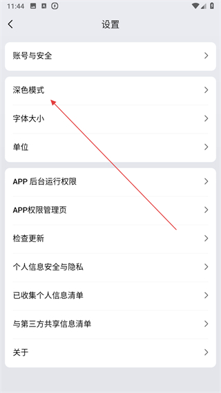 3、在设置界面里,找到深色模式选项并点击,进入深色模式设置。