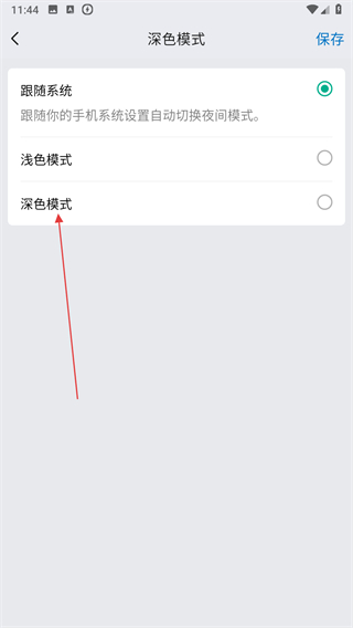 4、在深色模式设置页面中,选择深色模式对应的选项,点击保存。