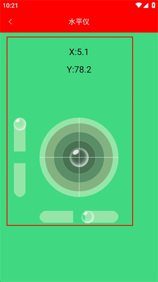 3、返回主界面点击水平仪图标,观察X、Y数值和气泡位置判断设备水平。