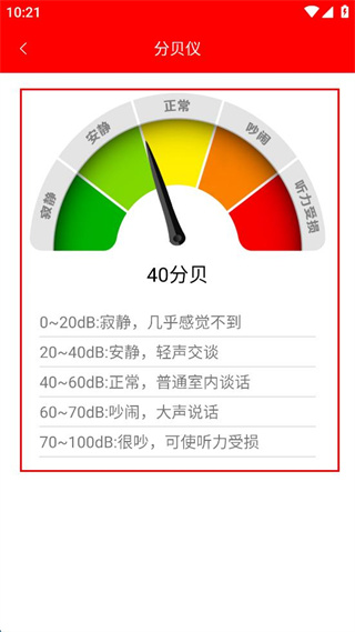 2、点击分贝仪图标,进入界面查看当前环境分贝数值及声音状态说明。