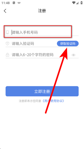 3、在注册页页面,输入手机号码,点击获取验证码。