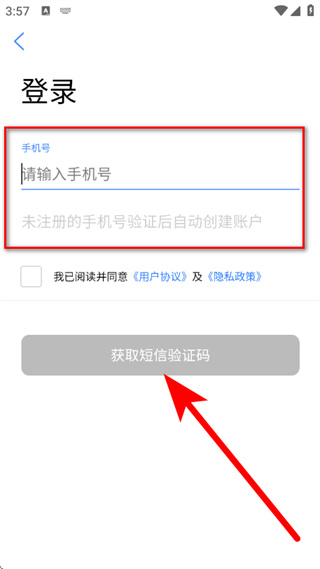 3、在登录页面,输入手机号并勾选协议后,点击获取短信验证码。
