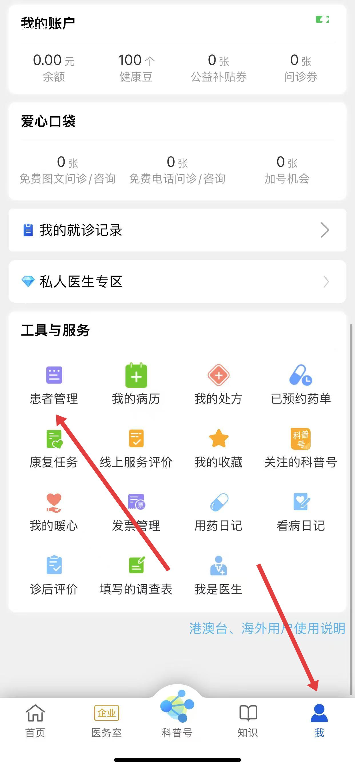 1、打开好大夫在线APP,在个人中心页面的工具与服务板块中,点击患者管理选项。