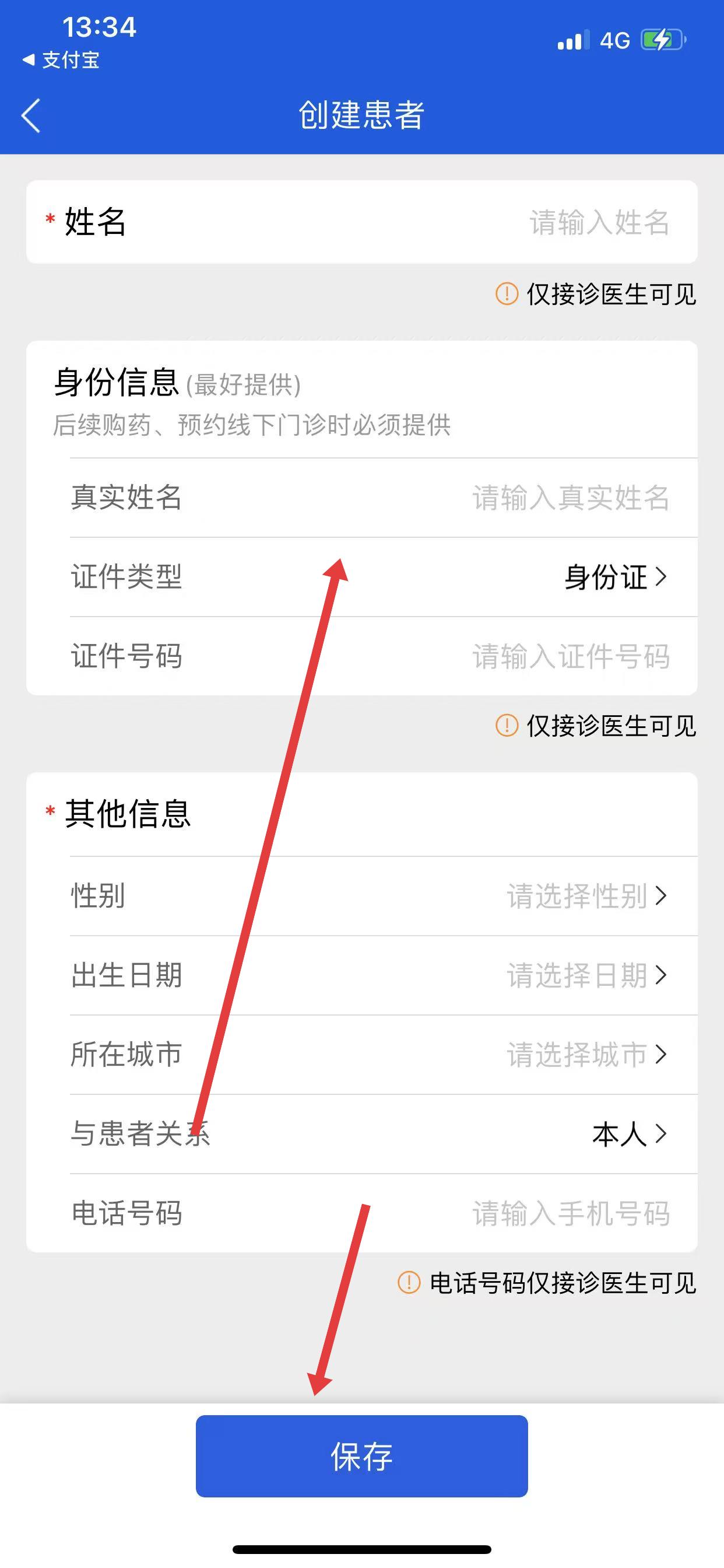 3、在创建患者页面,依次填写患者的姓名、身份信息、其他信息,点击保存按钮,即可成功添加患者信息。
