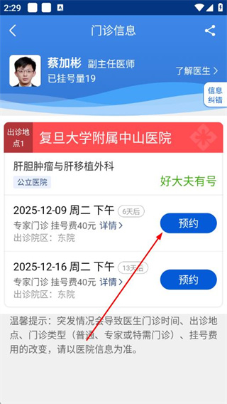 6、选择目标就诊时间,点击对应预约,完成挂号操作。