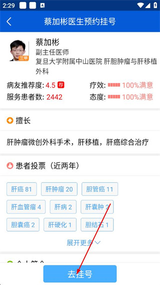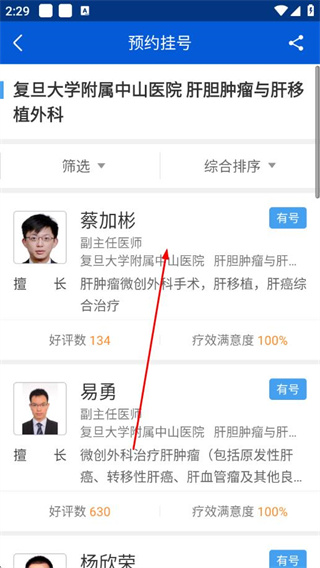 4、在医生列表中选择目标医生,点击进入医生预约挂号页面。