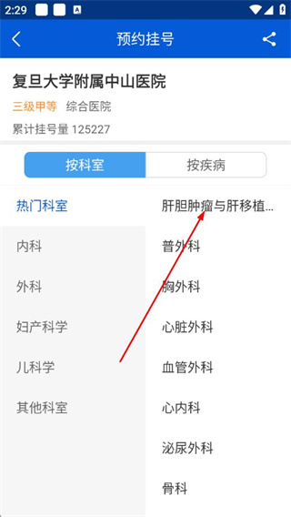 3、在医院详情页选择目标科室,进入科室医生列表页。