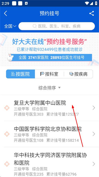 2、在预约挂号页面选择目标医院,点击进入医院详情页。