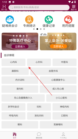 2、下滑首页,查看出诊排班,选择心内科心外科等科室,了解出诊信息,使用疑难病会诊专病随访等服务,管理健康记录用药提醒,获取精准医疗服务。