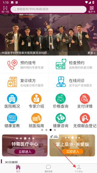 3、切换至个人中心页面,查询医院概况专家介绍等信息,进行价格查询支付详情操作,参与健康宣教就医指南,完成健康咨询无偿献血登记,管理个人就医事务。