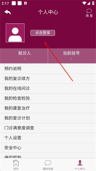 1、打开掌上阜外医院APP,点击底部个人中心选项。