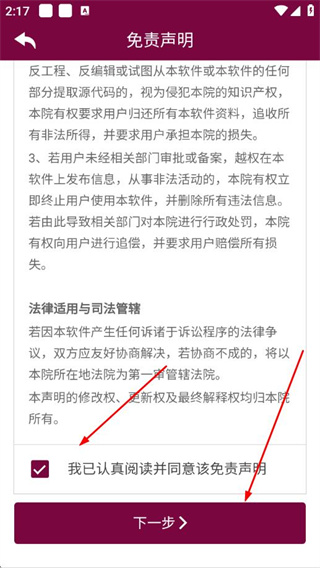 4、勾选我已认真阅读并同意该免责声明,点击下一步。
