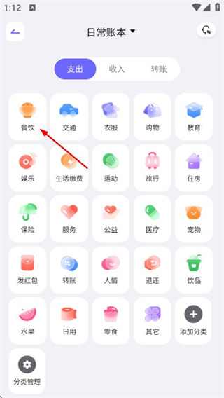 1、在首页点击记一笔按钮,进入记账分类选择页面。