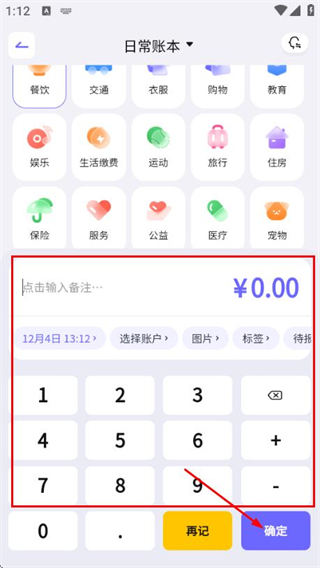 3、在记账信息填写页面输入金额、备注后,点击确定按钮,完成本次记账操作。
