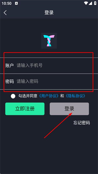 3、在登录页面填写手机号和密码,勾选协议后,点击登录完成账号登录操作。