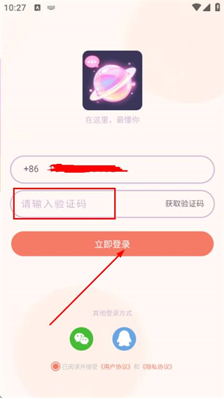 3、在验证码输入框中填写收到的验证码,点击立即登录完成账号的登录操作。
