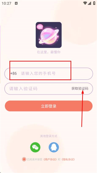 2、在手机登录页面填写手机号,勾选协议后,点击获取验证码。