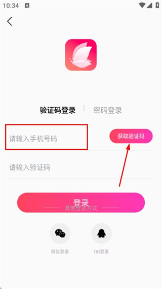 2、在手机登录页面填写手机号后,点击获取验证码。