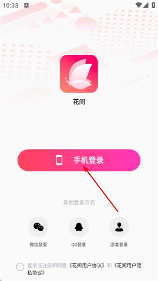 1、进入花小游勾选协议后,点击手机登录进入手机登录页面。