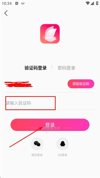 3、在验证码输入框中填写收到的验证码,点击登录完成账号的登录操作。