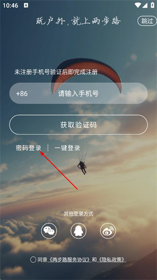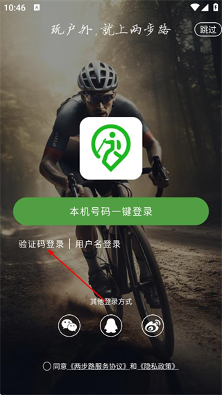 1、在两步路的登录页面,点击验证码登录选项,进入验证码登录界面。