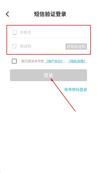 4、在短信验证登录界面,填写手机号与验证码,点击登录完成账号登录。