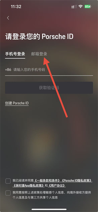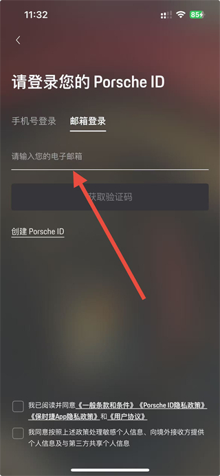 4、在邮箱登录页面,先勾选相关协议,再输入电子邮箱并获取验证码,填入后完成登录操作。