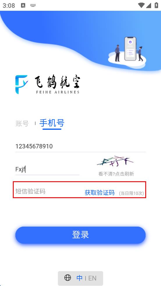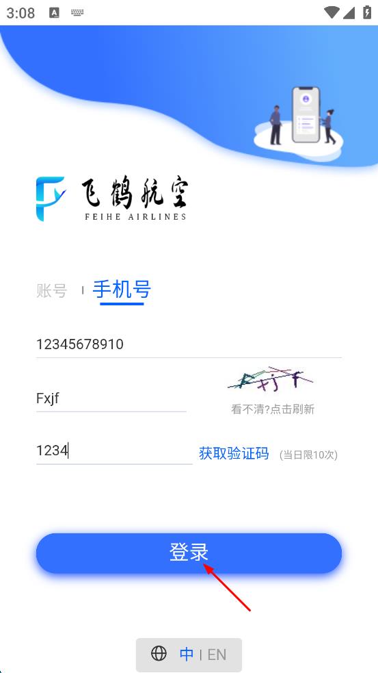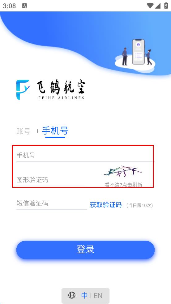1、打开飞鹤航空软件,在登录界面找到“手机号”选项,点击该选项切换到手机号登录页面。