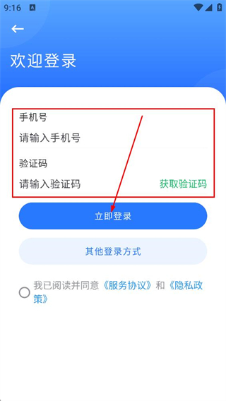 4、在验证码登录界面,填写手机号、验证码,点击立即登录,完成账号登录。