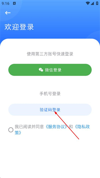 3、在登录方式选择页面,点击验证码登录选项,进入验证码登录界面。