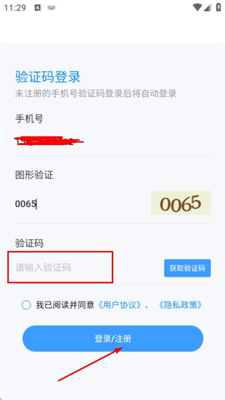 3、在验证码输入框中填写收到的验证码,点击登录完成账号的登录操作。