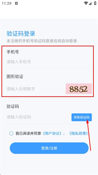 2、在手机验证登录页面填写手机号、图片验证码,勾选协议后,点击获取验证码。