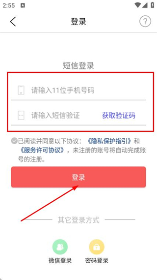 3、在登录页面填写手机号和验证码,勾选协议后,点击登录完成账号登录操作。