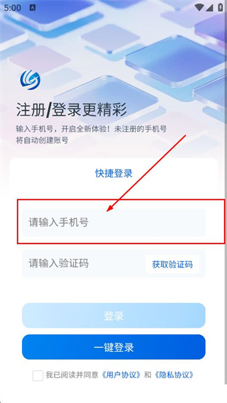 2、在注册/登录页面的快捷登录区域,填写请输入手机号,进行下一步。