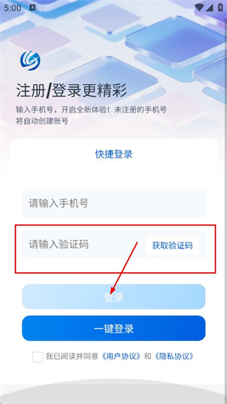 3、在快捷登录区域,点击获取验证码后填写验证码,点击登录完成账号登录。