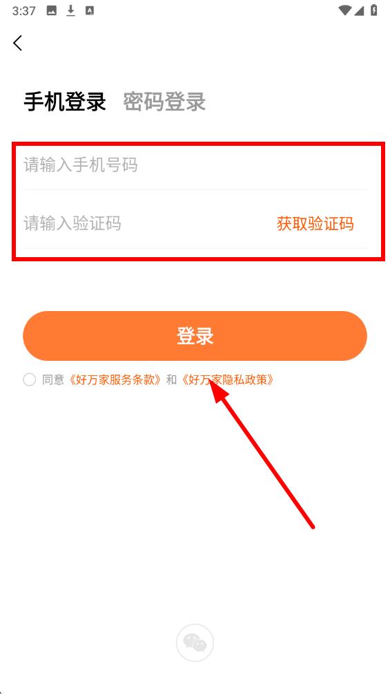 3、在登录页面选择手机登录方式,在请输入手机号码框内准确填写手机号,点击获取验证码后填入,最后点击登录即完成注册。