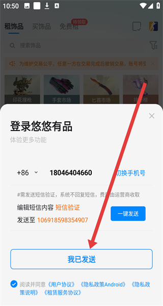 4、在编辑好短信发送后,点击下方我已发送按钮,即可完成登录操作。