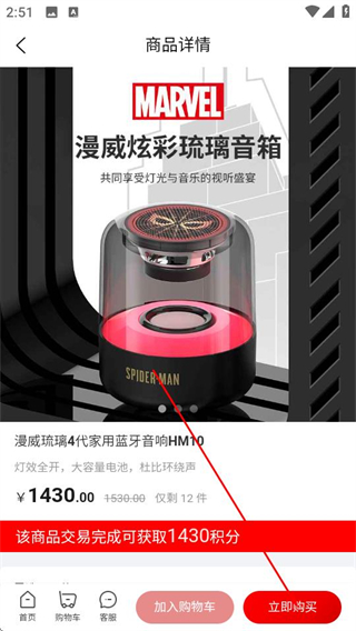 2、进入商品详情页后,点击底部的立即购买按钮。