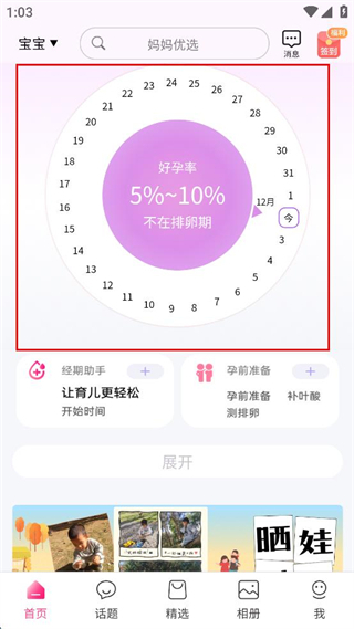 4、完成生日选择后进入软件首页,可查看好孕率等相关信息,完成初始设置流程。