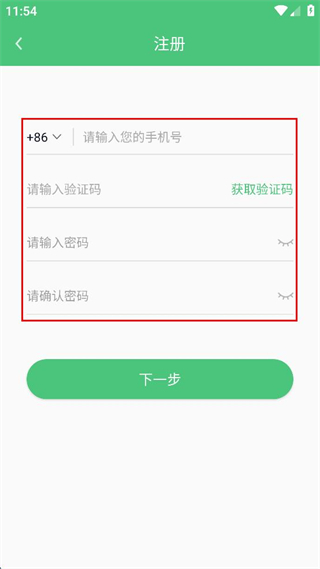 3、在注册界面依次填写手机号、验证码、密码及确认密码等相关注册信息。