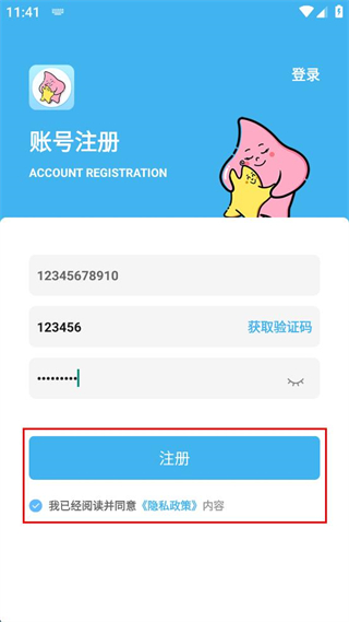 4、勾选我已经阅读并同意隐私政策内容的选项,点击注册按钮,完成账号注册操作。